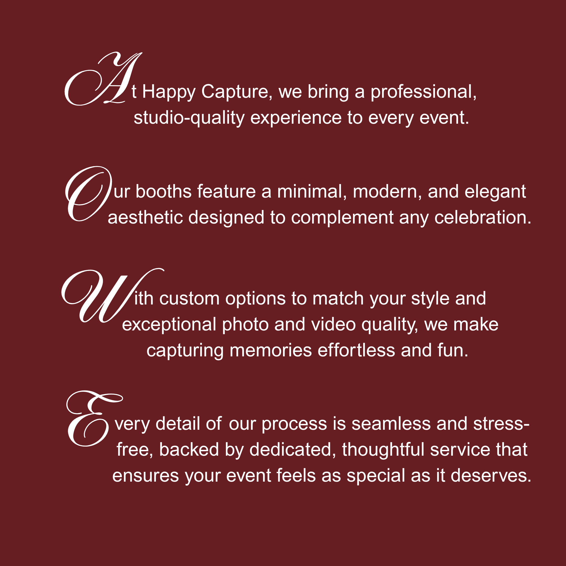 Enjoy a seamless, elegant photo booth experience , we’ll take care of the rest.